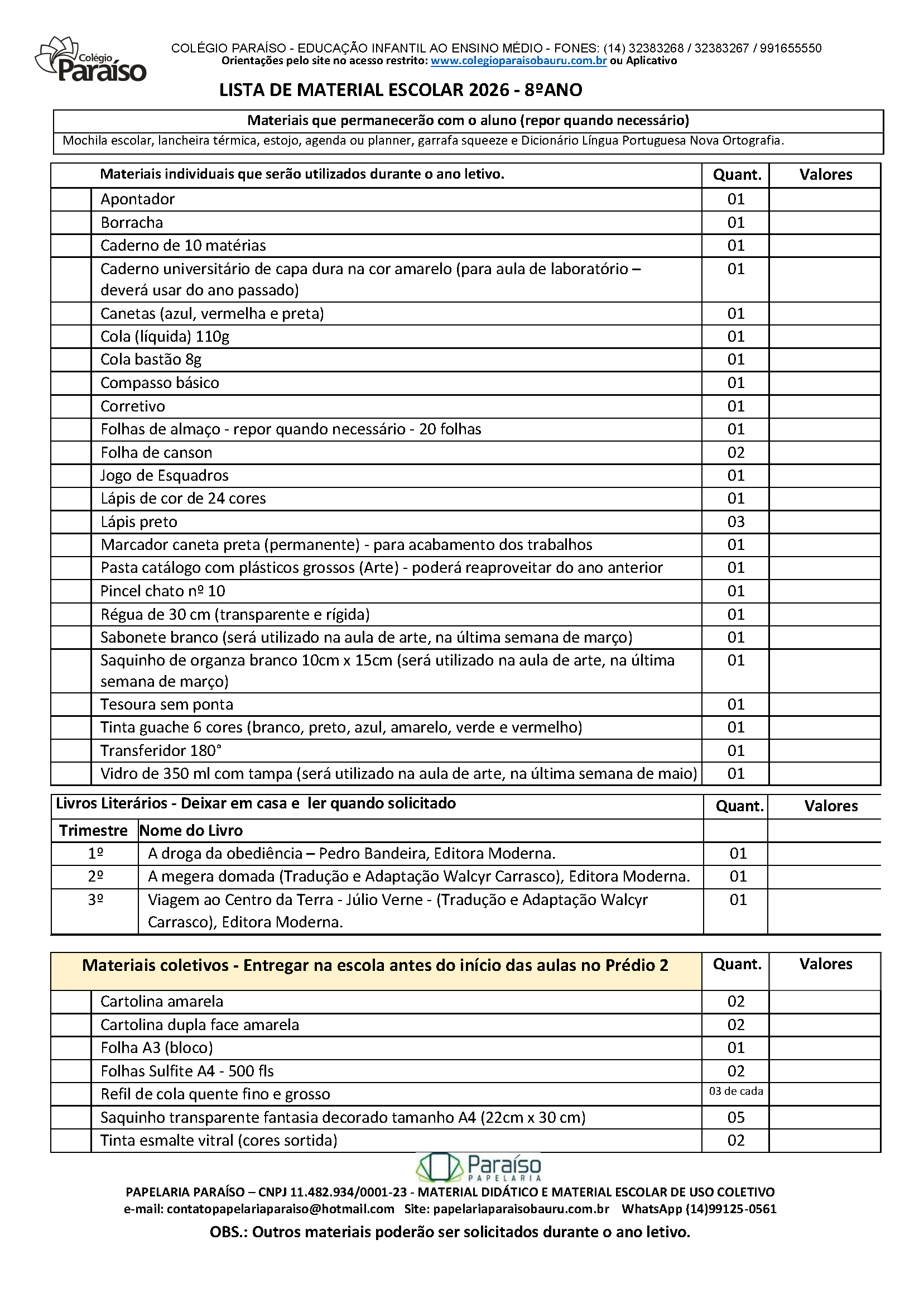 A comercialização refere-se exclusivamente aos itens de uso coletivo. Os demais materiais deverão ser providenciados pelos responsáveis.