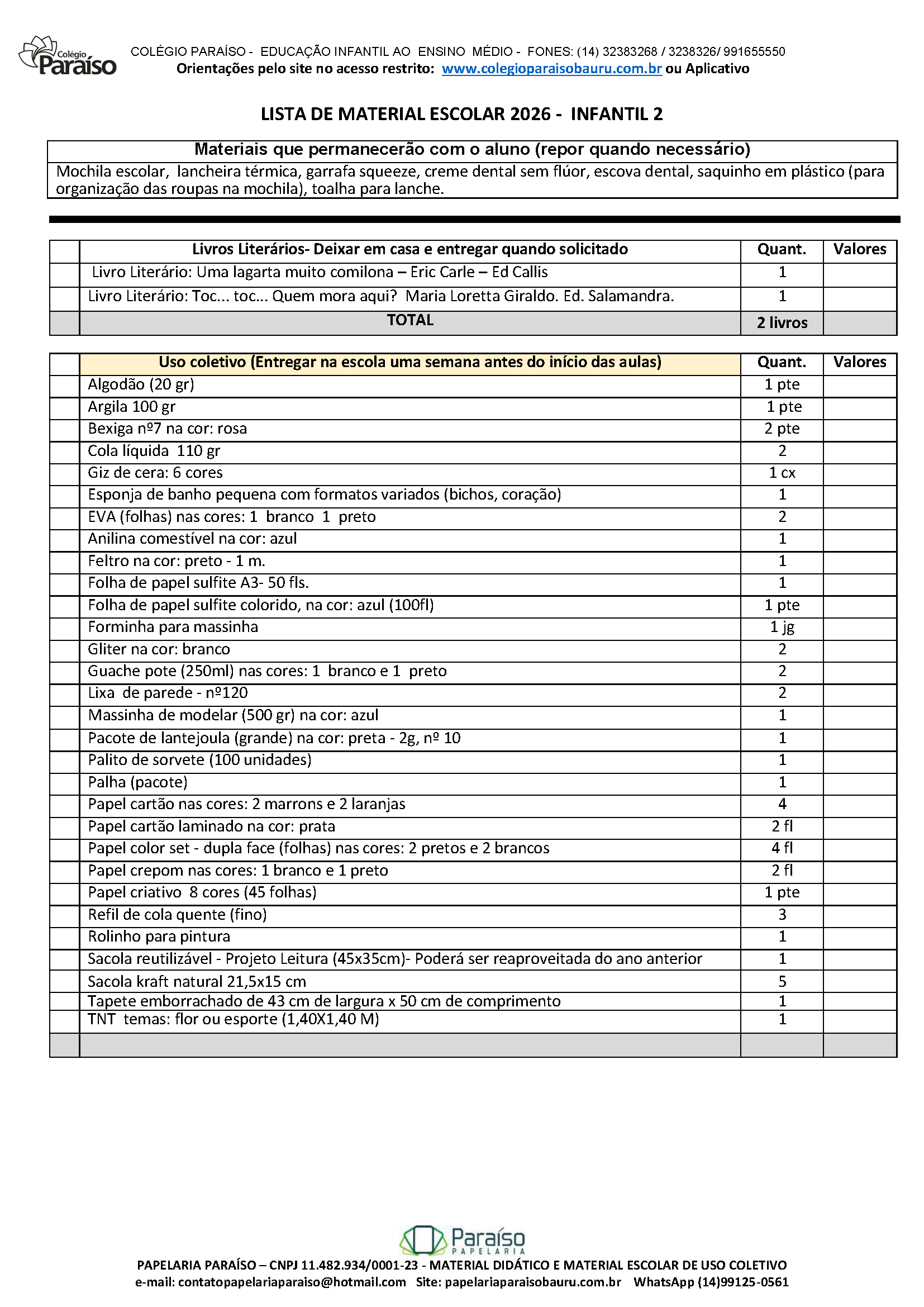 Material de uso coletivo de acordo com a lista de material 2026.