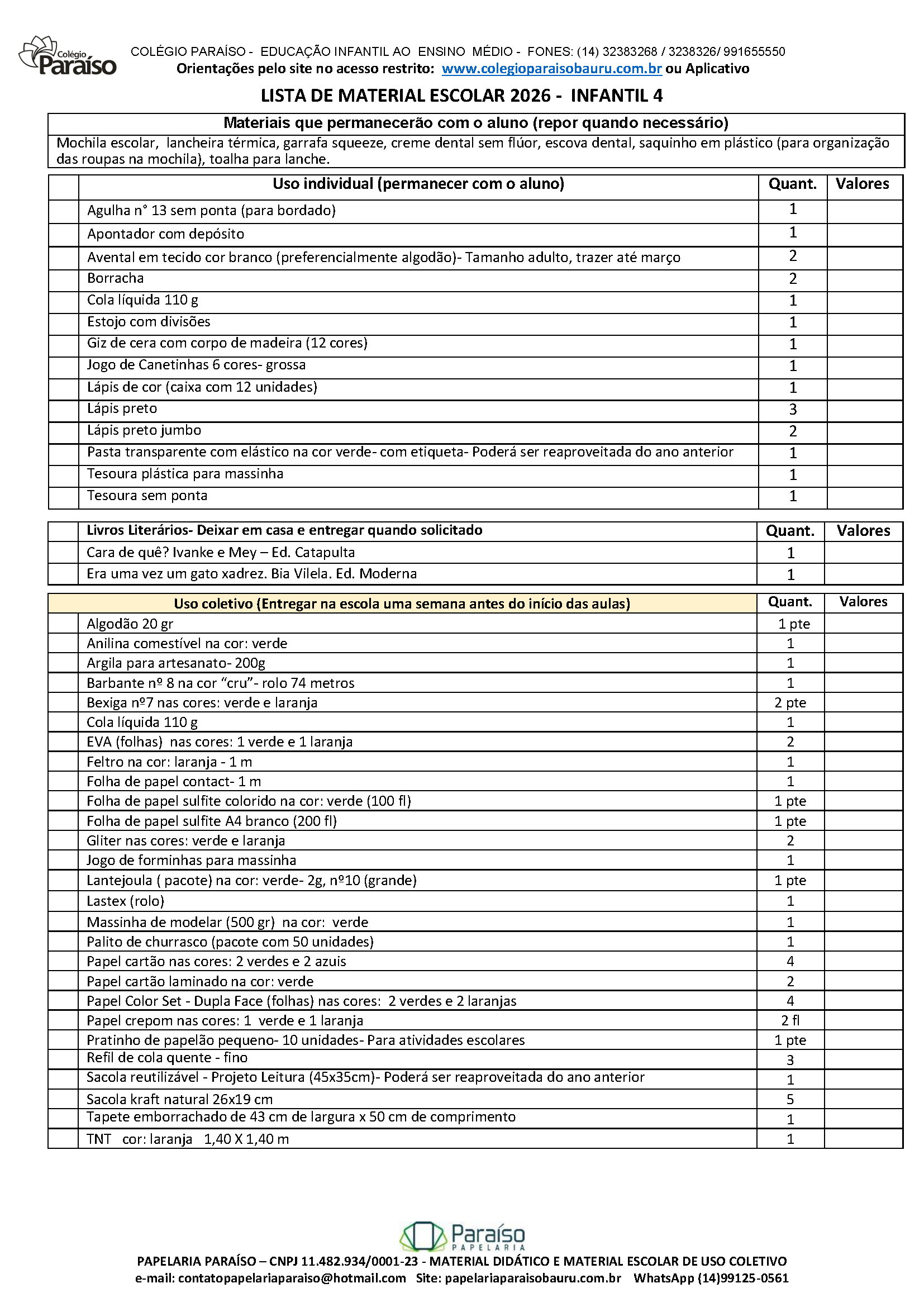 Material de uso coletivo de acordo com a lista de material 2026.