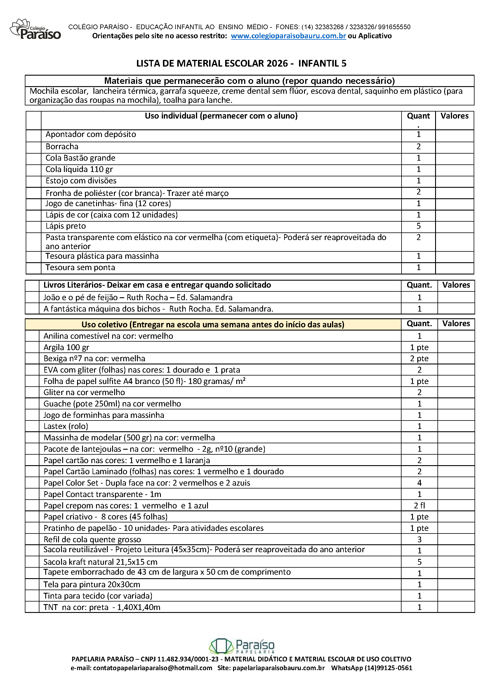 Material de uso coletivo de acordo com a lista de material 2026.